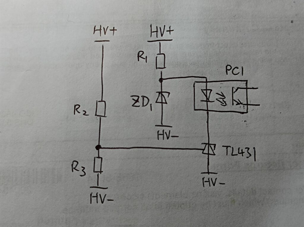 Combined with the circuit above, it’s clear that when the divided HV voltage goes above Vref of the TL431 (2.5V), the op-amp turns on and pulls its cathode to ground, activating the photocoupler. The Zener diode is there to limit the voltage across the TL431 when the transistor is off.