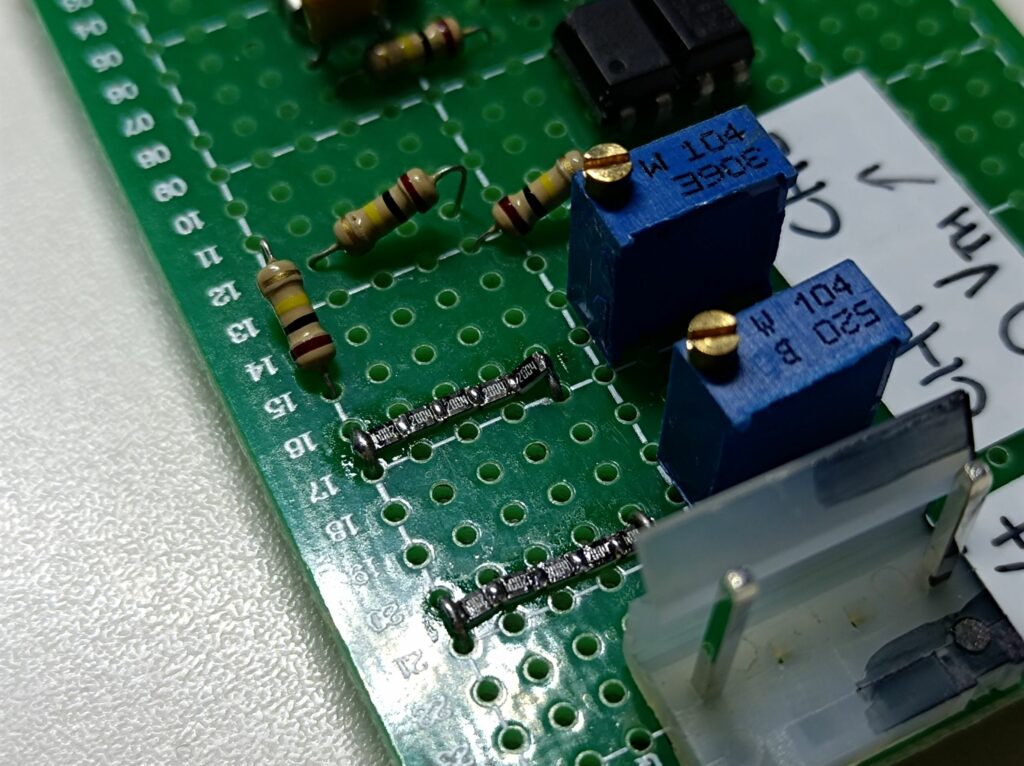Building the controller was straightforward; For the 5x 2MΩ resistors, to maximise creepage distance, I soldered resistors one by one on the top side of the veroboard. If I were to solder on the bottom pads, the distance between the board pads would be shorter than the resistor pad spacing. For the HV input, I used a 3.96mm-pitched header with the middle two pins removed for isolation spacing. I also scraped the pads on the veroboard between the high voltage terminals to help increase the creepage distance.