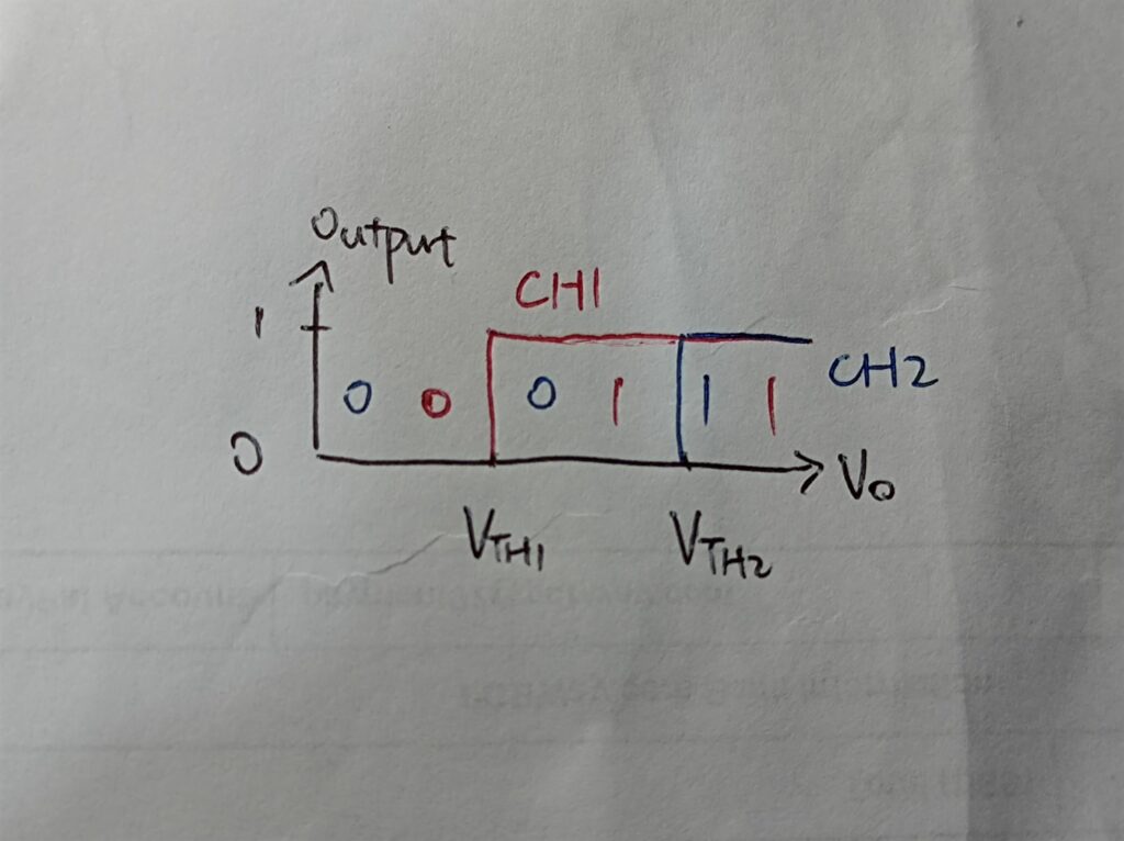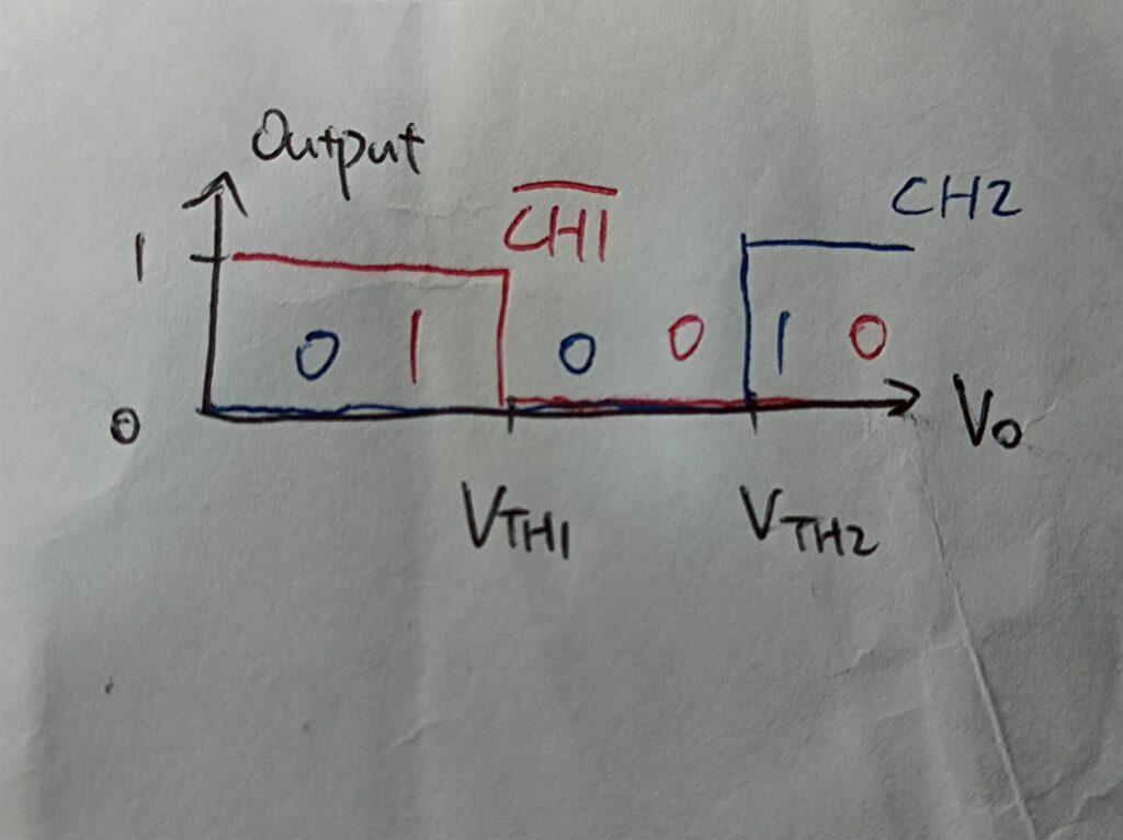 To achieve hysteresis, I would need two channels of the basic HV sensing. Let’s say they’re CH1 and CH2, and CH1 has a lower triggering voltage. Then their output logic is as follows: