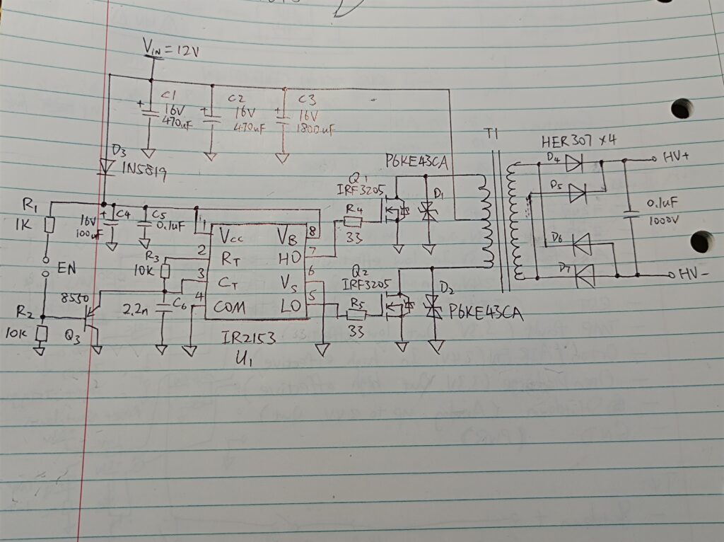 IR2153 is a simple oscillator with built-in MOSFET drivers and bootstrap circuits for driving a half-bridge up to 600V, with a fixed duty cycle of 50%. Due to its simplicity, it was popular among hobbyists for making simple tesla coils, induction heaters, coilgun high-voltage capacitor chargers, etc. I can’t remember where I found the schematic this was based on, but here is the schematic of what I built:
