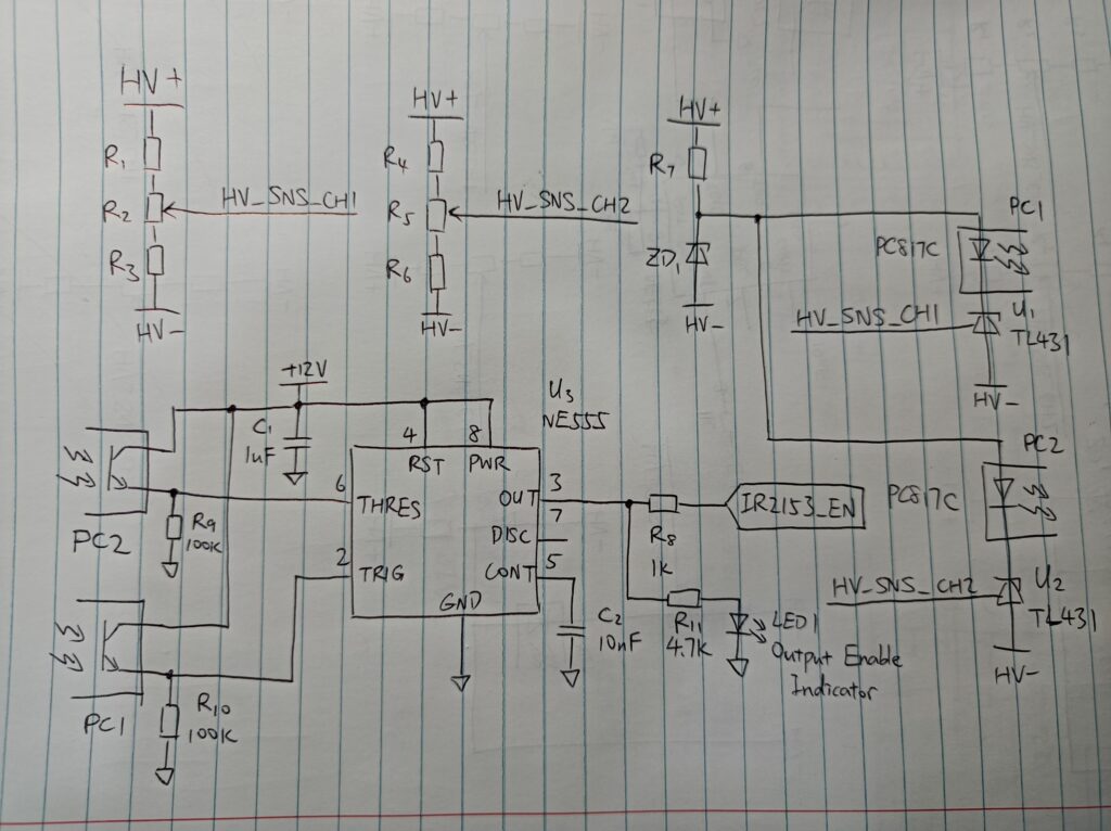 Now, back to the main topic – voltage feedback. I didn’t need the output voltage to be very precise, so a simple hysteresis controller would serve the purpose. It works by turning off the IR2153 when the output voltage is too high and turning it back on when the voltage is too low. The time between on/off shouldn’t be too short, just to keep the IR2153 happy.