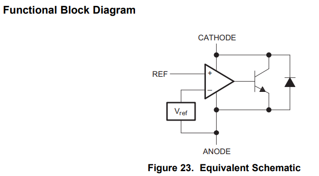 TL431 is a type of precision shunt regulator that I used as a comparator with a built-in 2.5V reference. From its datasheet, its equivalent schematic is as follows: