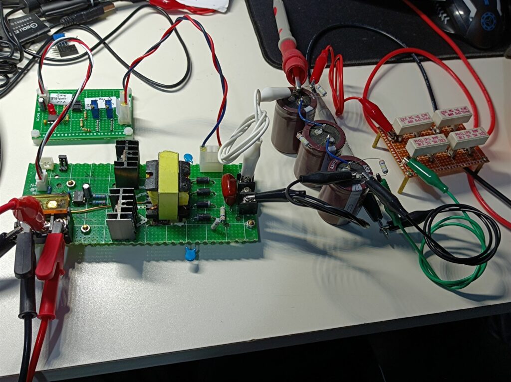 Here’s the testing setup. Just in case the voltage gets too high, I had three 450V 330uF capacitors in series as the load, each with a 300K 1W resistor soldered on, as the bleeding resistor. Other than this, I also added a resistor board which is made up of four 3.3K 5W resistors in series, for discharging the capacitors quickly.
