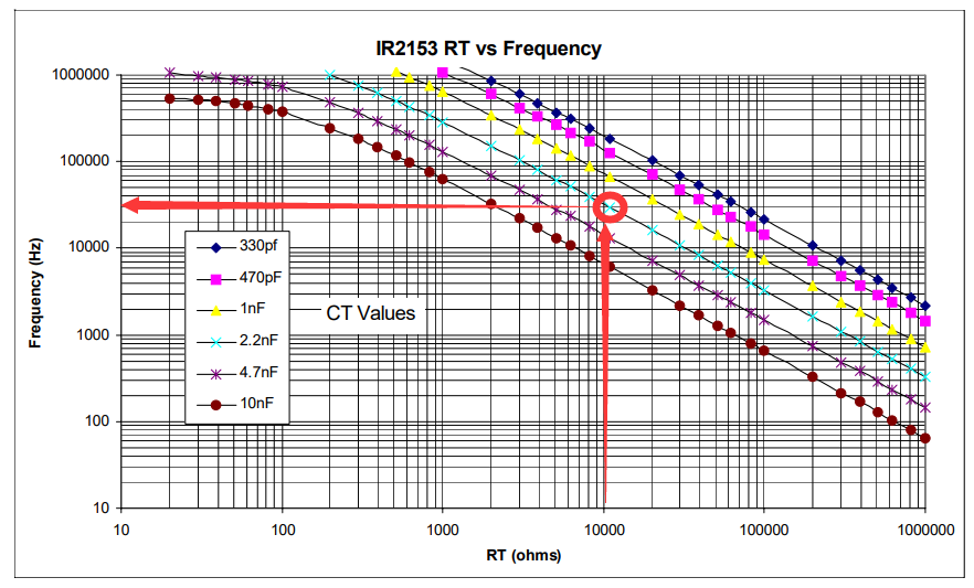In my case, the IR2153 was configured with a 10KΩ/2.2nF combo for the oscillator. According to its datasheet, that would give a working frequency of about 30kHz: