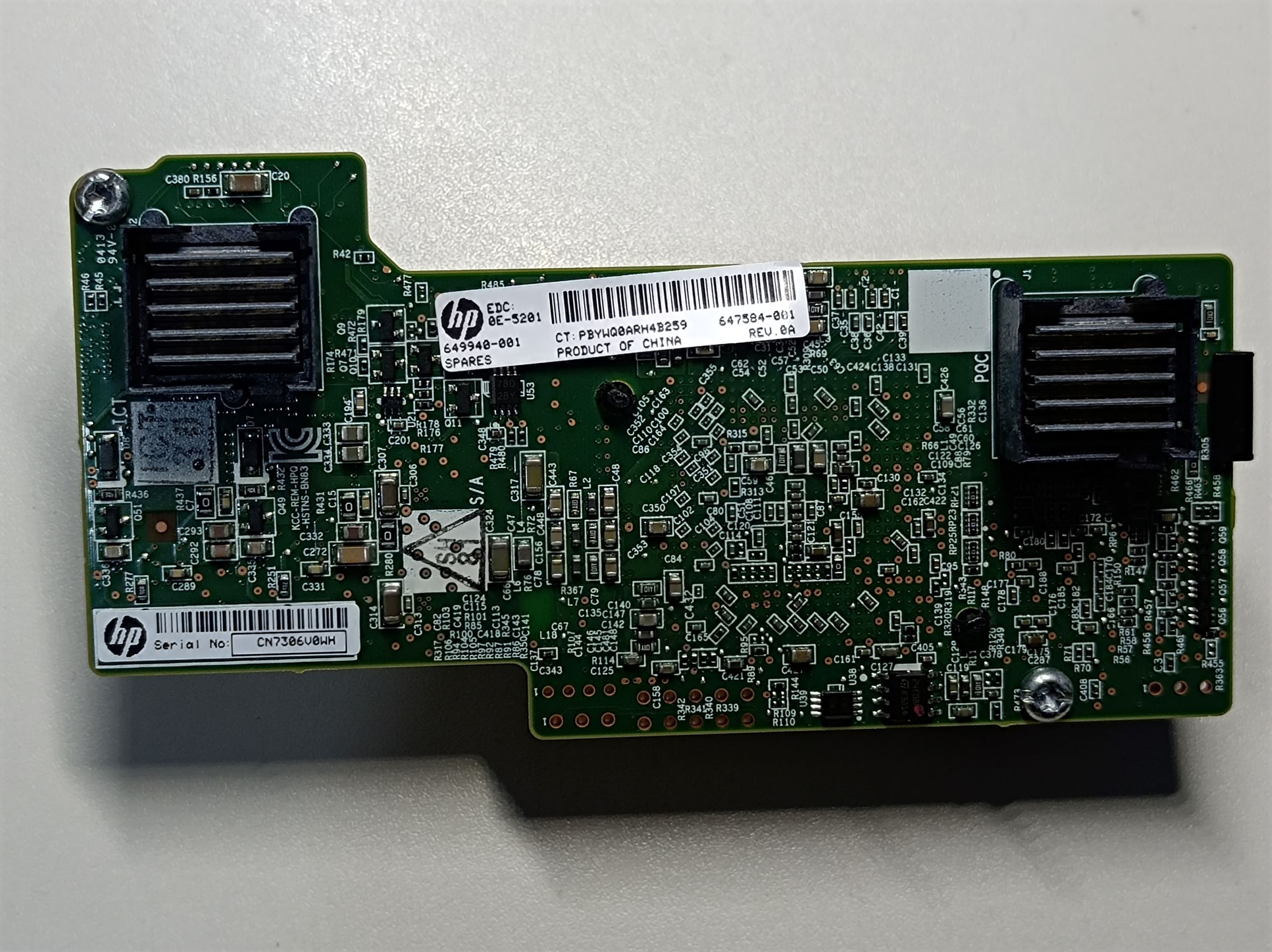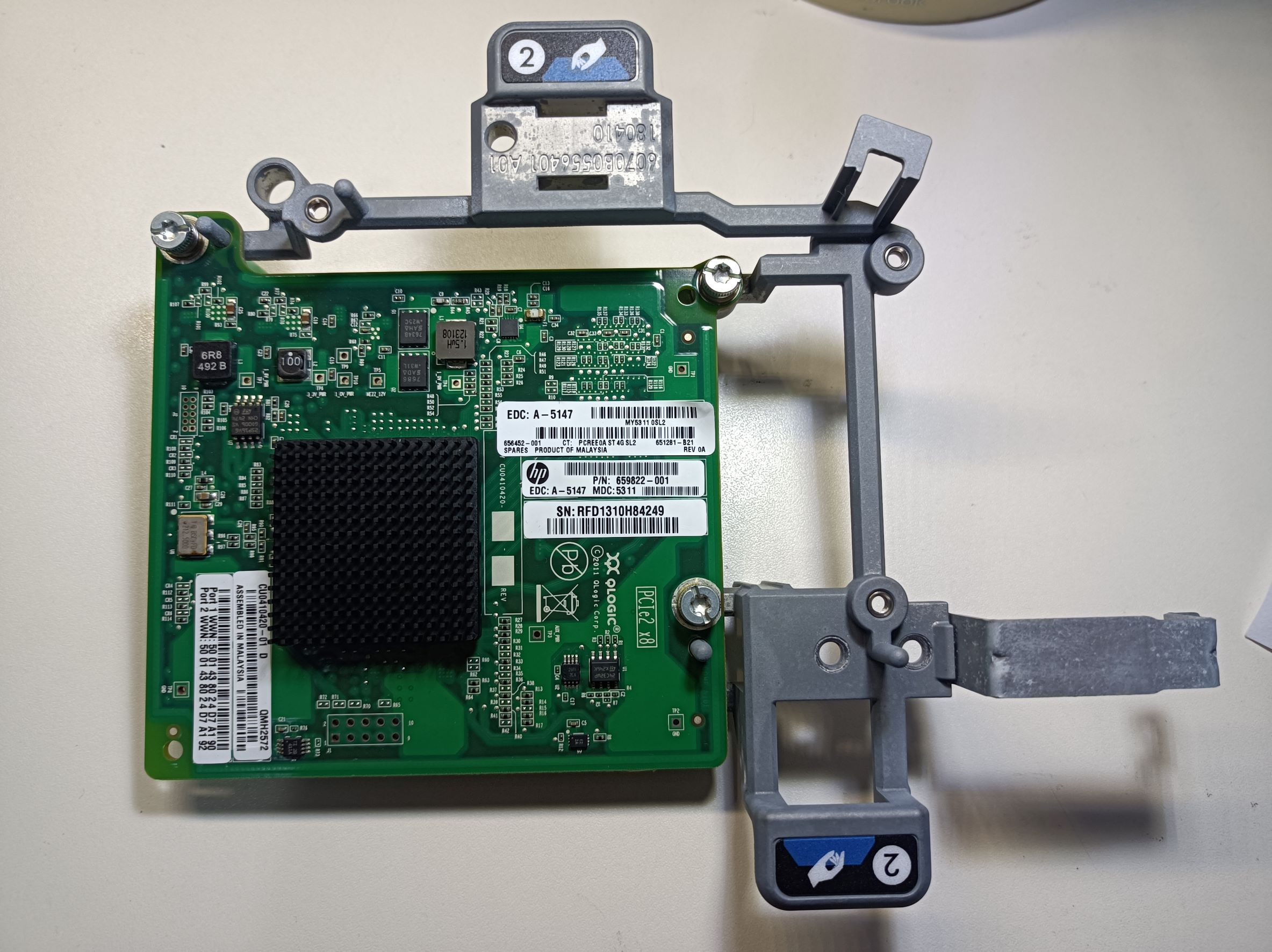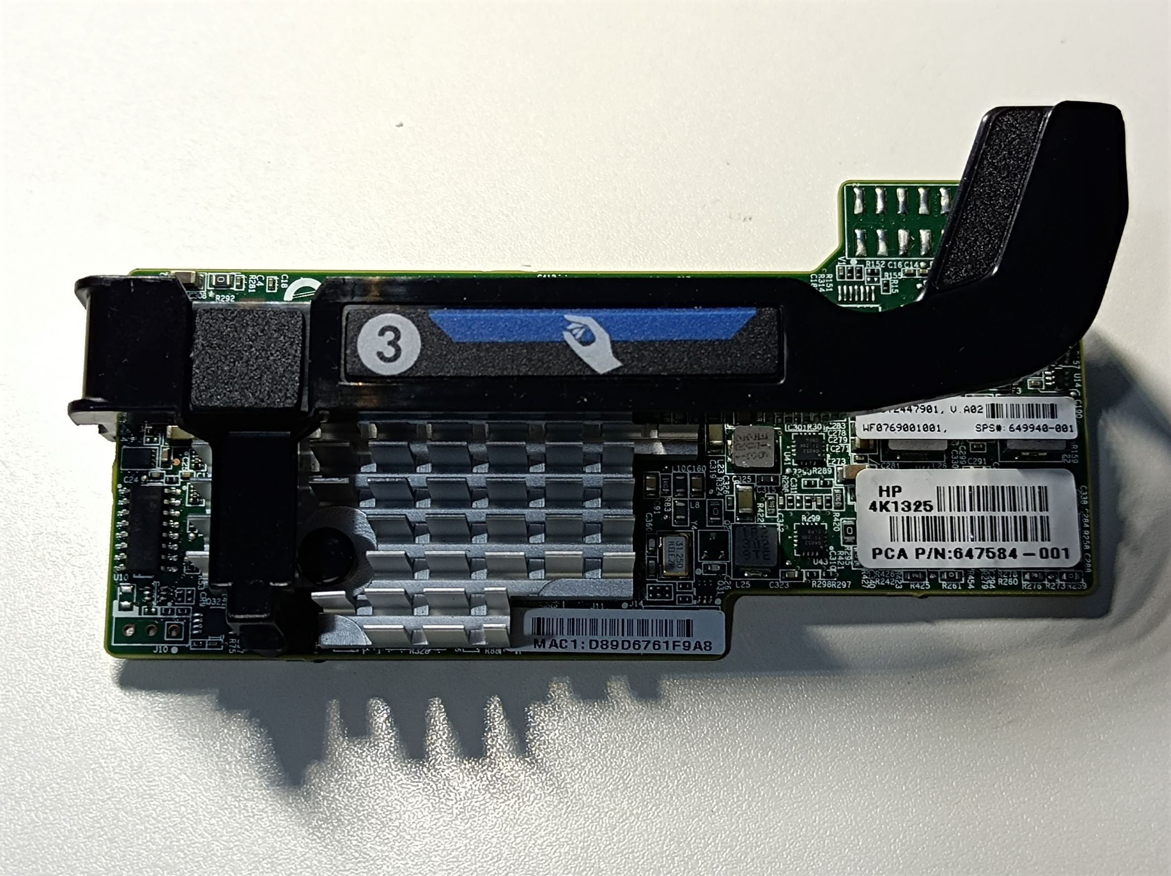 The blade also came with a 2-port 8Gb fiber channel HBA card (QMH2572, part number: 659822-001) and an onboard network card (FlexibleLOM 554FLB, part number: 647584-001). These cards plug into the also proprietary mezzanine PCIe slots on the motherboard and provide communications via the backplane connector to the enclosure. Here are some photos of the cards: