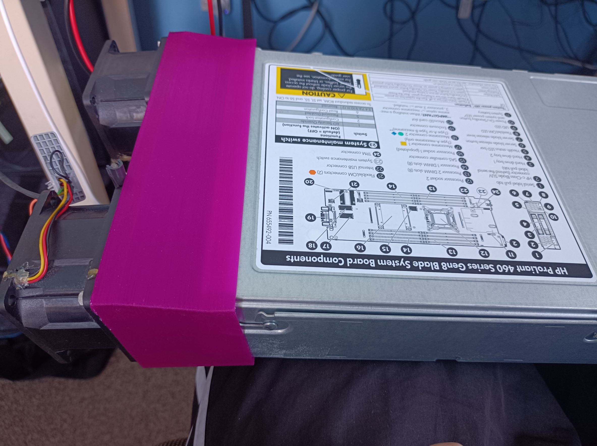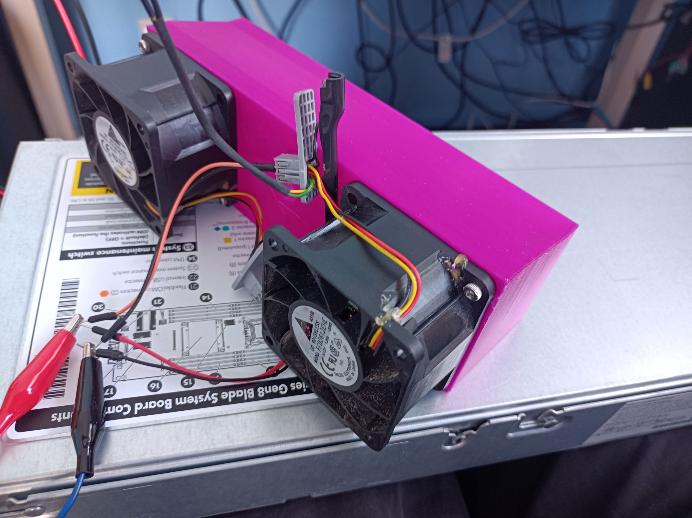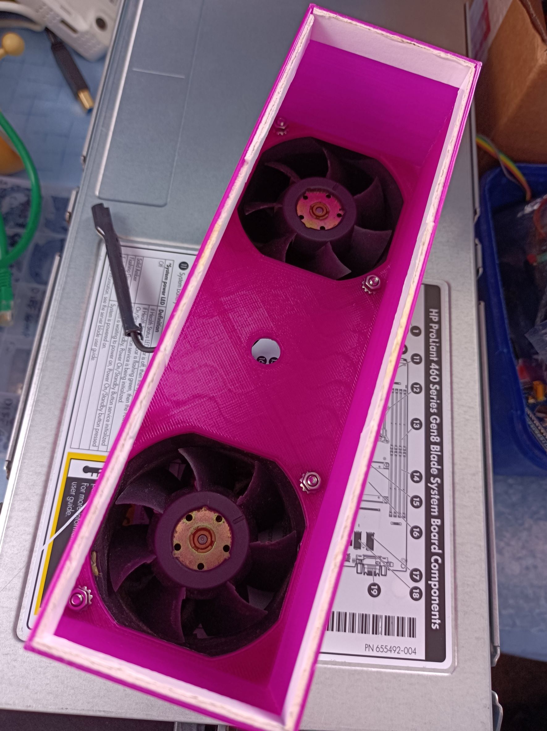 In later testing with this, I used a bench supply to power the fans and to set different voltages (as running them at full 12V gets very loud). The server seems to cope well with the fans supplied with 7V, while the hottest spot was near the HD controller, at about 63C. The HP iLO management interface provides an intuitive 3D view of the temperature sensors which made the hotspots really obvious.