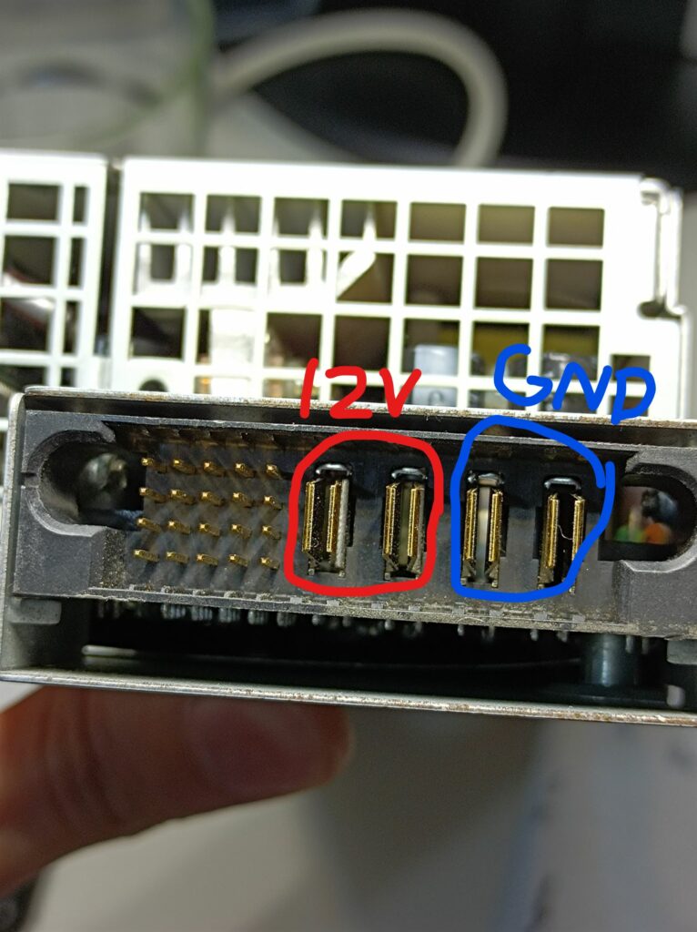 Starting server power supplies are usually fairly simple – there should be a few control pins that turn on the supply when they’re pulled down to GND. Here’s a photo of its output connector: