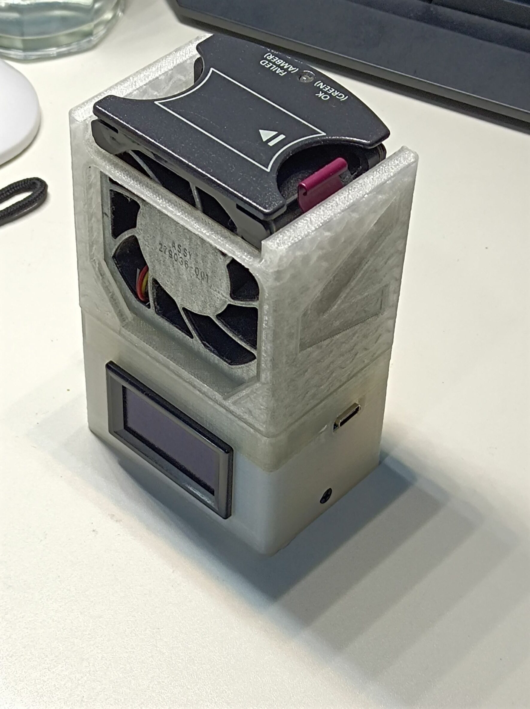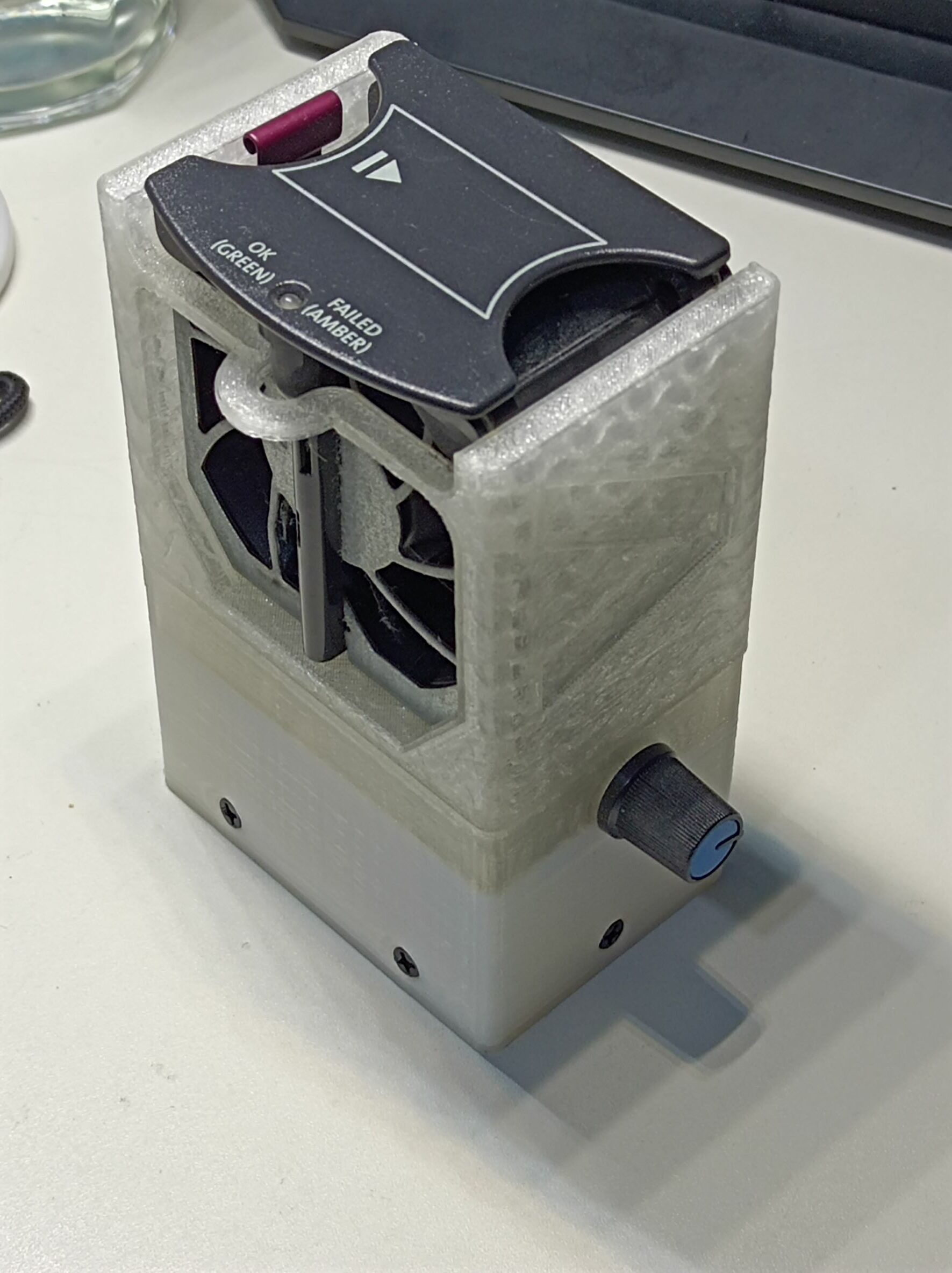 The hole in the middle was supposed to run the power cables and any signal wires, although once this was printed, I had to drill out extra holes for power at better locations. Here’s the adapter assembled with fans: