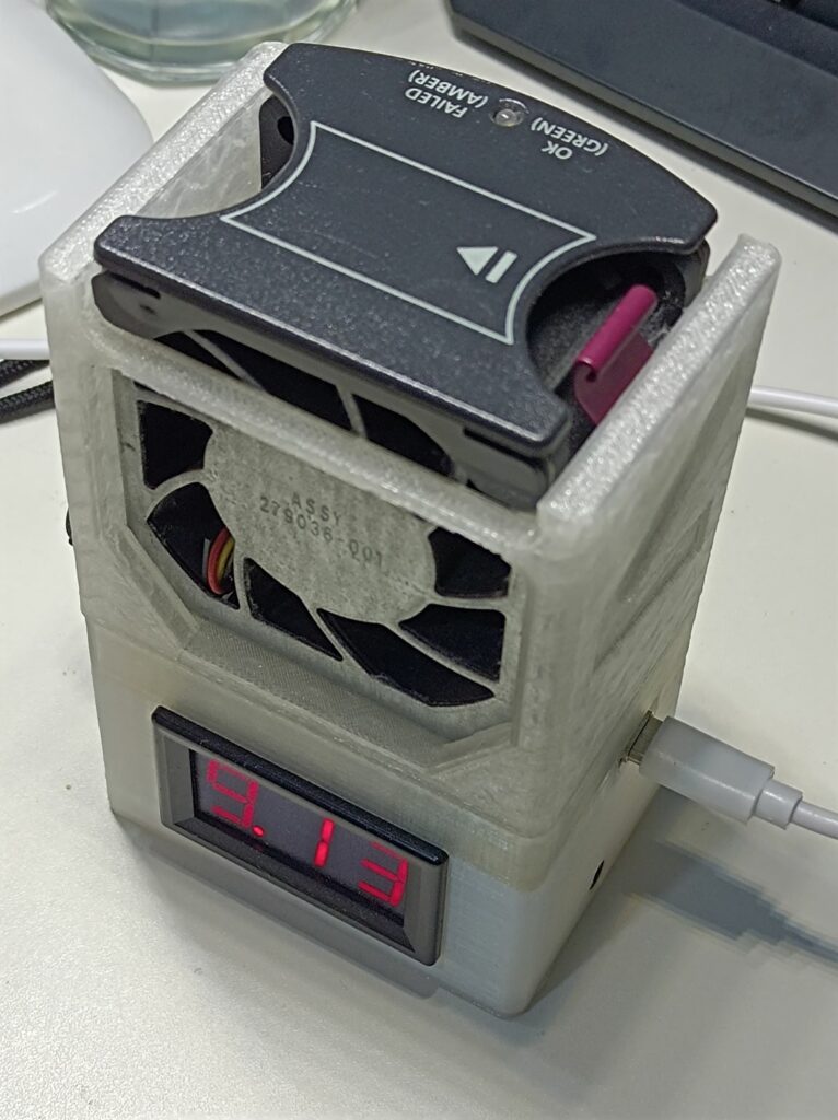 Like with the power supply, during initial testing, I used a server fan in an adapter/base I made earlier, which takes 5V power via a USB port and steps up the voltage. There’s also a POT on the side for adjusting the output voltage, and a voltmeter on the output. It’s shown in the photos below: