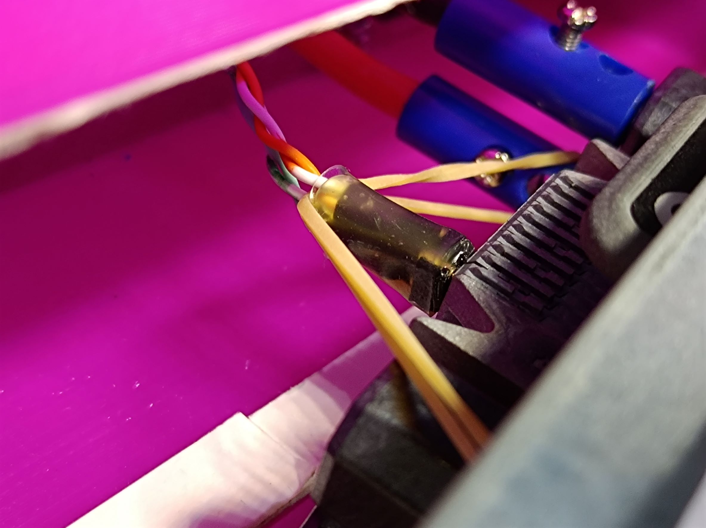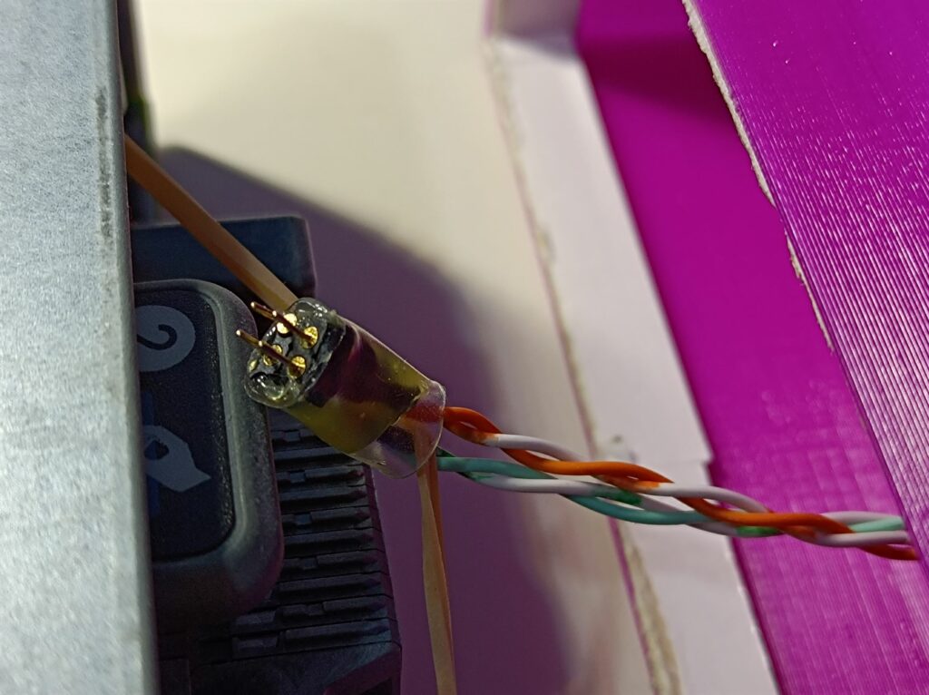 From measurement, the pin pitch of the backplane connector is about 1.9mm, so I used some 2mm headers I had on hand to make a simple 2×2 header block, using hot glue and heat shrink. The pins were a bit short, so I used a small rubber band to make sure the header stays in place.