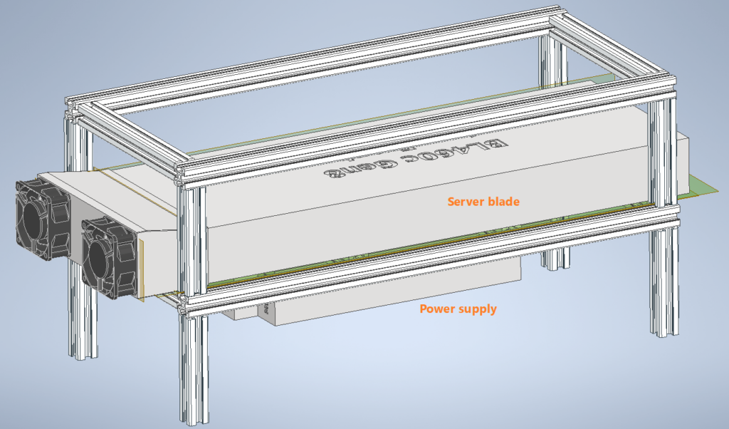 In my design, the Aluminium extrusions form two levels, with the lower level holding both the power supply and the server blade, and the top level just for stopping the blade from sliding laterally. I used simple butt joints for the extrusions to simplify cutting and allow the reuse of these extrusions in the future if I need to. As the lower platform will take most of the weight, I had it sit on the bottom vertical pieces so the joints aren’t bearing the weight.