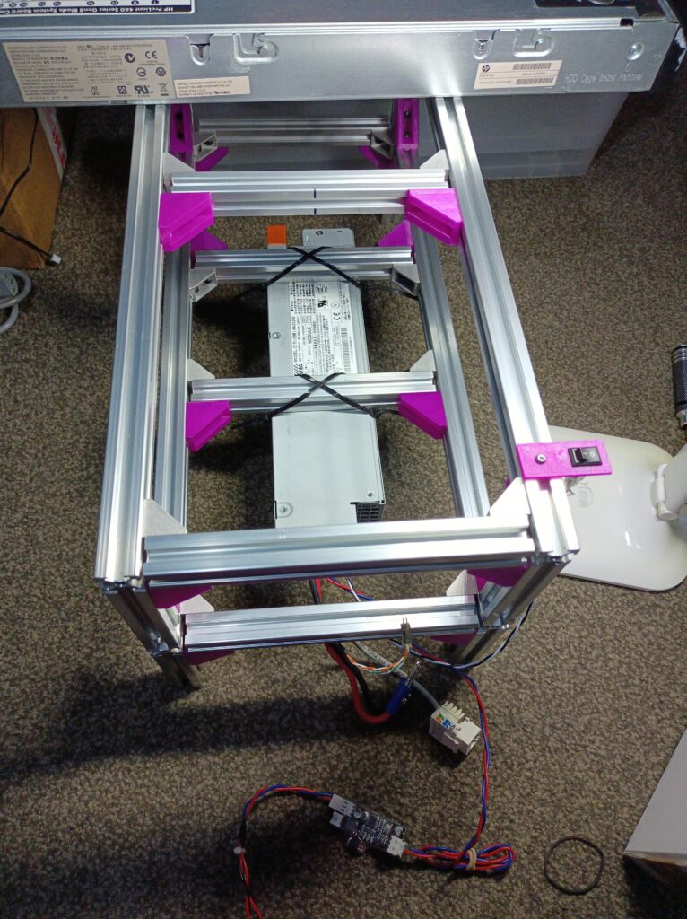 I did consider designing some printed brackets for holding the power supply, although I figured the time required probably doesn’t really justify it. It’s a one-off installation, and if this breaks, I would be using some other server supply that would have a different geometry anyway.