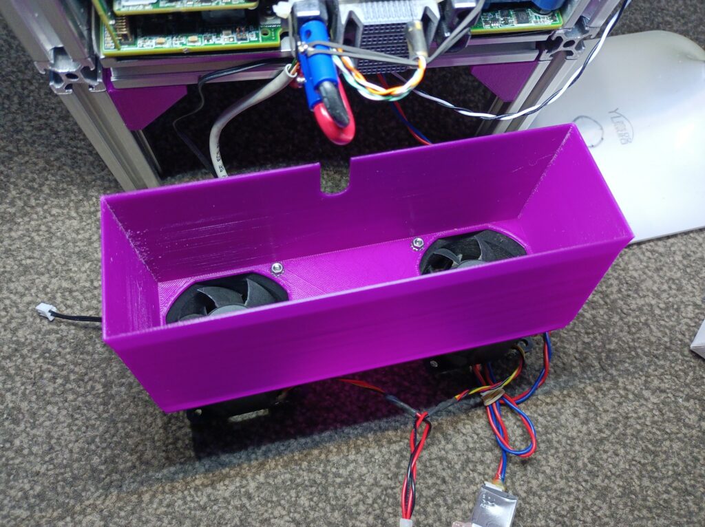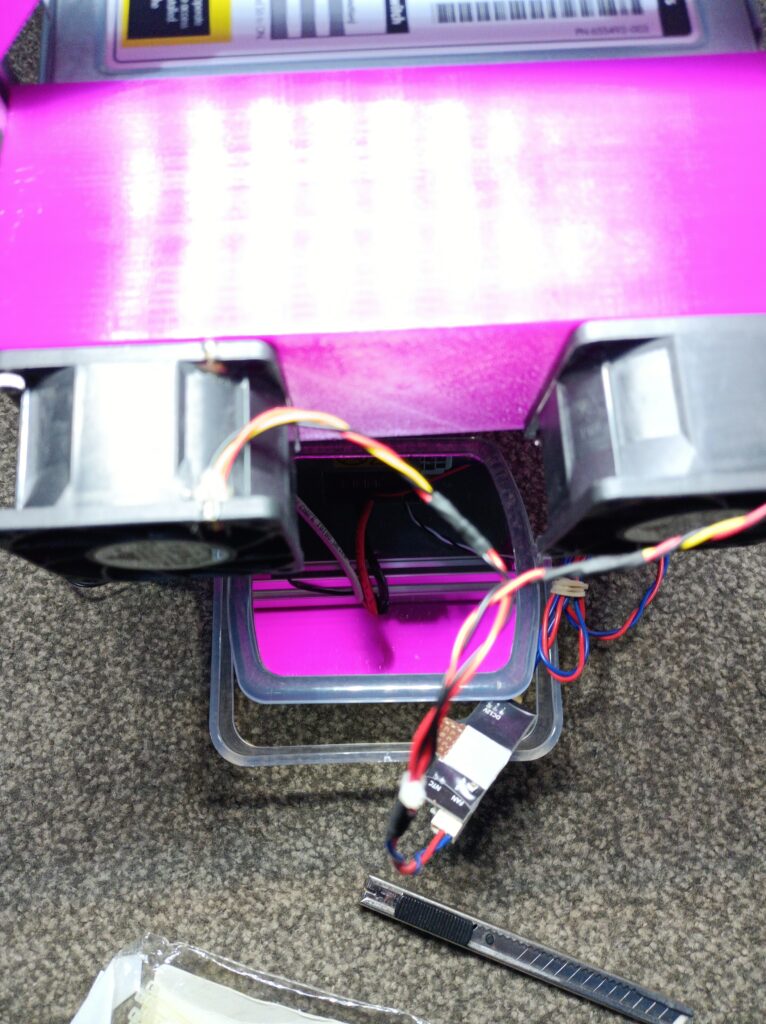 Once it’s all put together, I configured the controller to idle the fan at 20% of the full output, the temperature at which the fan speed increases was set to 40 ℃, and the temperature band in which fan speed gets gradually increased to maximum was set to 15 ℃ (i.e. the fans will reach full power when the thermistor is 55 ℃ or higher).