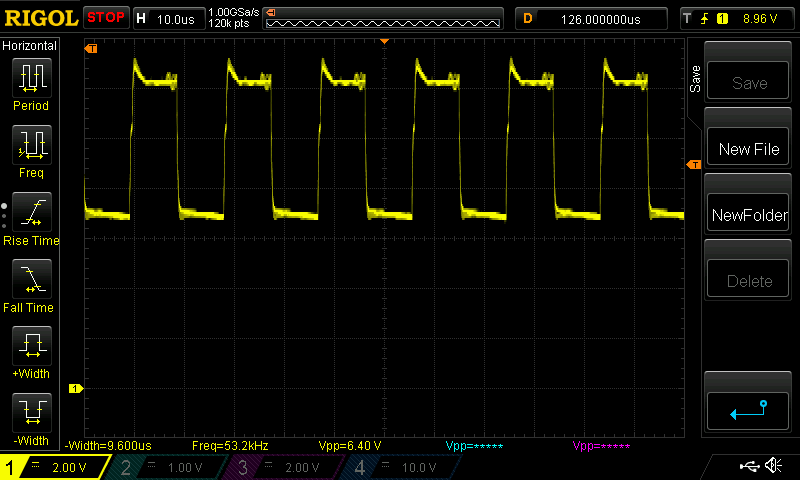 Once I put it back together and tested it with a 2A load, it worked! The output voltage waveform wasn’t very clean, but I think that would be mainly due to the small output capacitors and the low switching frequency. The fans still worked across the entire speed-setting range. Here’s the gate waveform of the new MOSFET (referenced to ground), which wasn’t bad (shown below). The heating of the inductor was also acceptable.