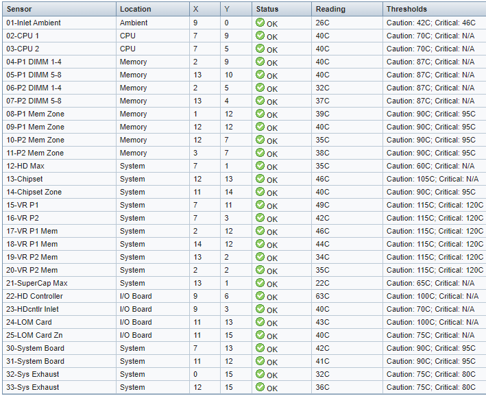 Lastly, here are some thermal test results. The fan controller was set to increase the fan speed above 40 ℃ and will reach the full 12V output at 70 ℃. To get the idling temperature, I let the system boot to Windows 10 and sit idle for at least half an hour to reach thermal equilibrium. The system seems to idle at about 130W with dual E5-2620 and 16x 8GB DDR3 1333MHz RAM. Through the iLO interface I can see the highest temperature is at “22-HD Controller”, which is 63 ℃: