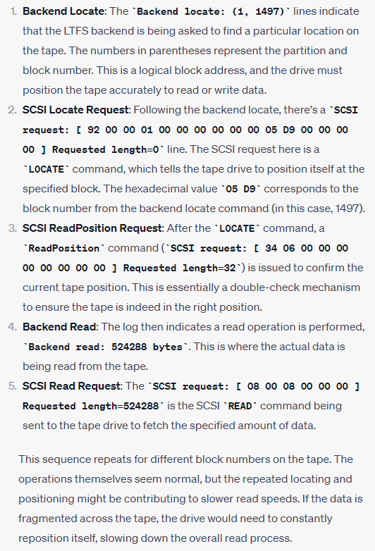 Just by looking at the logs without any knowledge of SCSI commands, I noticed there were a lot more small transfers when reading from the tape compared to when the tape is being written. When writing to the tape, it seems to write blocks sized 512KB one after another, without interruption. To get more information about what’s happening, I asked ChatGPT (GPT-4 model) to interpret the reading logs: