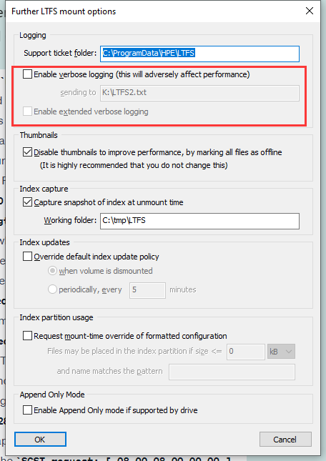 Next, I played around with various settings in the LTFS Configurator tool by HPE, and nothing helped. Then, I noticed the tool supports mounting the volume with verbose logging:
