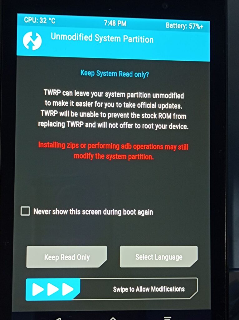 A few moments later, the TWRP screen will appear, it’ll switch to a terminal view briefly with some lines of red text (some mounting errors), and then the tablet will reboot. Now the tablet will boot into the Android system and take a few minutes, possibly setting up the stock system after a factory reset. After that’s done, power off the tablet and enter the bootloader again by holding the Volume Down and the power buttons. Re-run the above command to try again. This time, it should get into the TWRP screen asking about write access. Swipe to allow write access to the system partition.